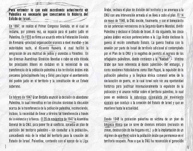 El día 30 por la mañana Celebramos el conversatorio ¿Qué está pasando hoy en Palestina? Para este conversatorio las y los alumnos prepararon un folleto informativo que hace un recorrido histórico explicando cómo se forma el Estado sionista explicando que para entender lo que pasa en Palestina hay que hablar del intento de exterminio del pueblo palestino sobre el que se construye el Estado israelí. Este díptico se repartió entre todos los asistentes al conversatorio (53 alumnxs).