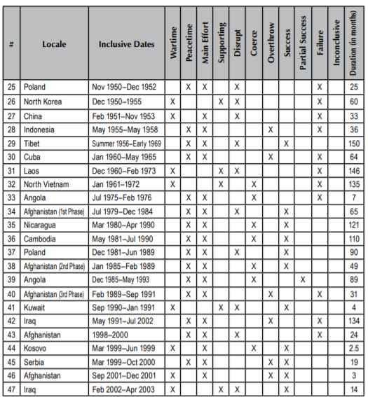 Veis que hay casi tantos éxitos como fracasos y que la coerción fue el método más eficaz para el éxito de las operaciones porque aunque a veces no se consiguió formalmente el cambio de gobierno sí sirvió para que se moderase y aceptase la influencia de EEUU. Pero lo relevante es que, en las conclusiones, se dice que «el apoyo a la resistencia civil no violenta parece ser más probable que tenga éxito que el apoyo a la resistencia armada» (y añade que un «estudio pormenorizado» de esta cuestión se está realizando en la actualidad por la Universidad de Denver) aunque ello «a menudo aborda problemas inmediatos y de corto plazo en lugar de intereses a largo plazo por lo que es una aspiración loable pero no siempre eficaz» (y este es el dilema ahora mismo en Venezuela, esto lo digo yo), o que hay que tener mucho cuidado con «las brechas de seguridad», es decir, que alguien se vaya de la lengua (y dice que esta es una de las razones del fracaso en Cuba), por ejemplo.