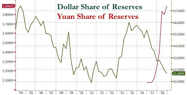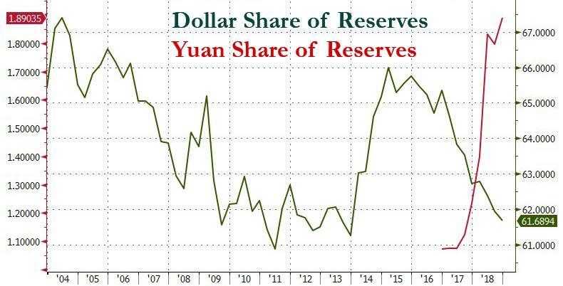 Porque esta subida del yuan ha provocado que el meteorito que va a terminar con la vida del dinosaurio se haya acercado aún más: el dólar ha bajado oficialmente como moneda de reserva global situándose en un peligroso -para EEUU- 61’7%. En el año 2000 superaba el 72% y ha ido bajando progresivamente y EEUU ha incentivado y provocado guerras (Libia 2011) y conflictos (Ucrania 2014) cuando ha visto seriamente amenazada su hegemonía monetaria. Pero es una tendencia que no puede parar.