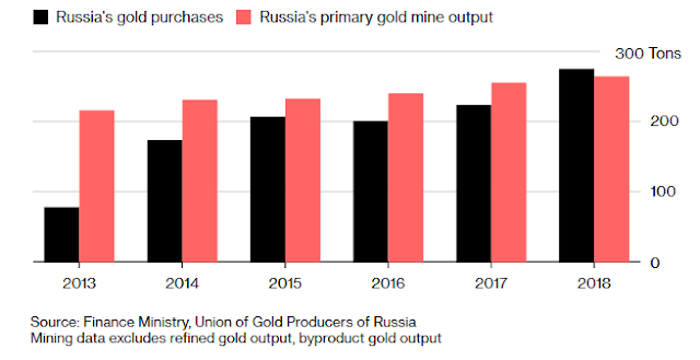 El Banco Central de Rusia acaba de anunciar que 2018 ha sido el más «ambicioso» en la compra de oro, situándose en el quinto tenedor de oro del mundo, muy cerca ya de Italia que, a este ritmo, será superada por Rusia en el 2020-21.