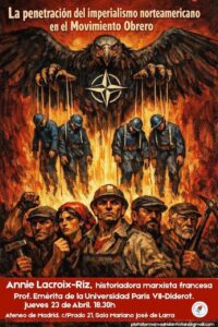 Desde la Plataforma de Madrid Contra la OTAN y las Bases se convoca este acto, con la profesora marxista de la Universidad de París Annie Lacroix-Riz.