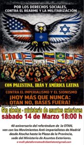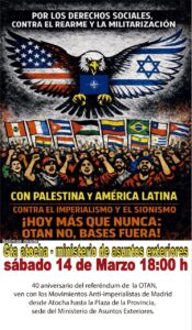 En respuesta al llamamiento a la movilización en todo el estado con motivo del 40 aniversario del referéndum de la OTAN, los Movimientos Antiimeprialistas de Madrid, entre los que se incluye el FAI, convocan a una manifestación el sábado 14 de marzo, a las 18 horas, desde la glorieta del Emperador Carlos V (Atocha) hasta el Ministerio de Asuntos Exteriores (Plaza de la Provincia)