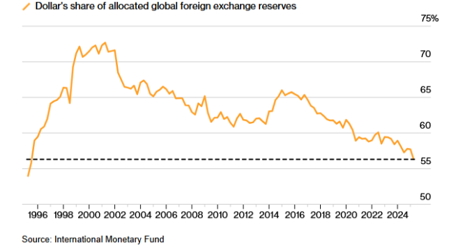 El año comenzó con otra pérdida del dólar como moneda de reserva de los bancos centrales del mundo, situándose en el 57’4% en enero. Pues bien, cuando aún queda un trimestre para que termine el año la proporción de reservas en dólares sigue disminuyendo y está en el 56’3%, según el Fondo Monetario Internacional.