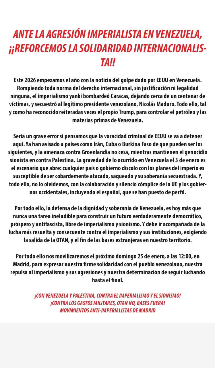 Por todo ello nos movilizaremos el próximo domingo 25 de enero, a las 12:00, en Madrid, para expresar nuestra firme solidaridad con el pueblo venezolano, nuestra repulsa al imperialismo y sus agresiones y nuestra determinación de seguir luchando hasta el final.