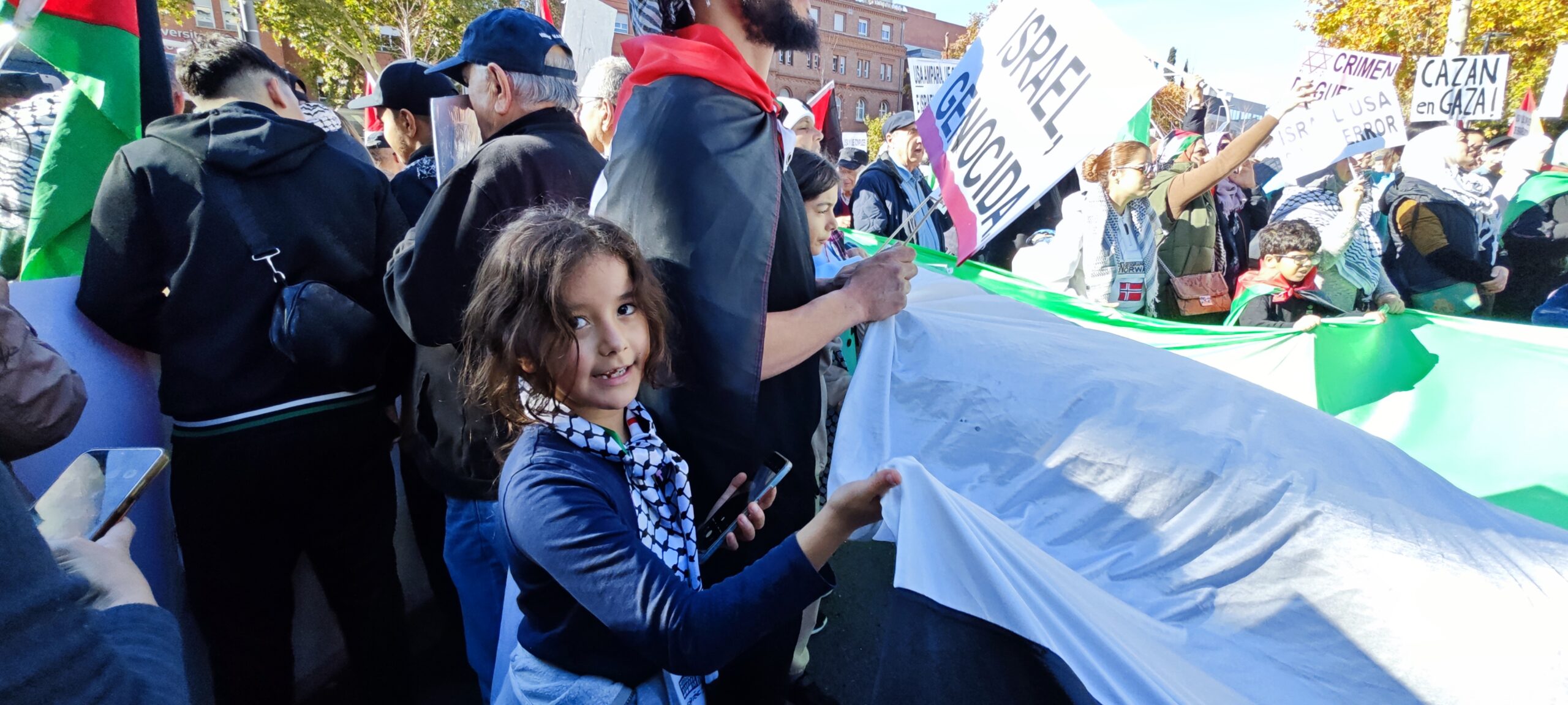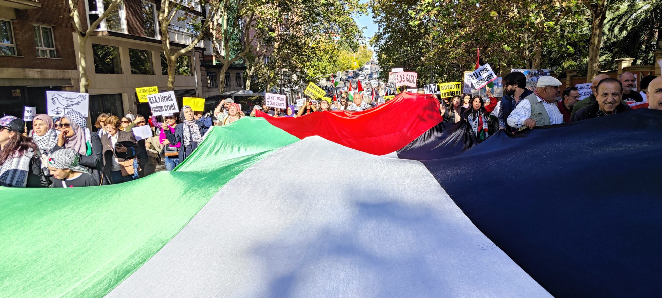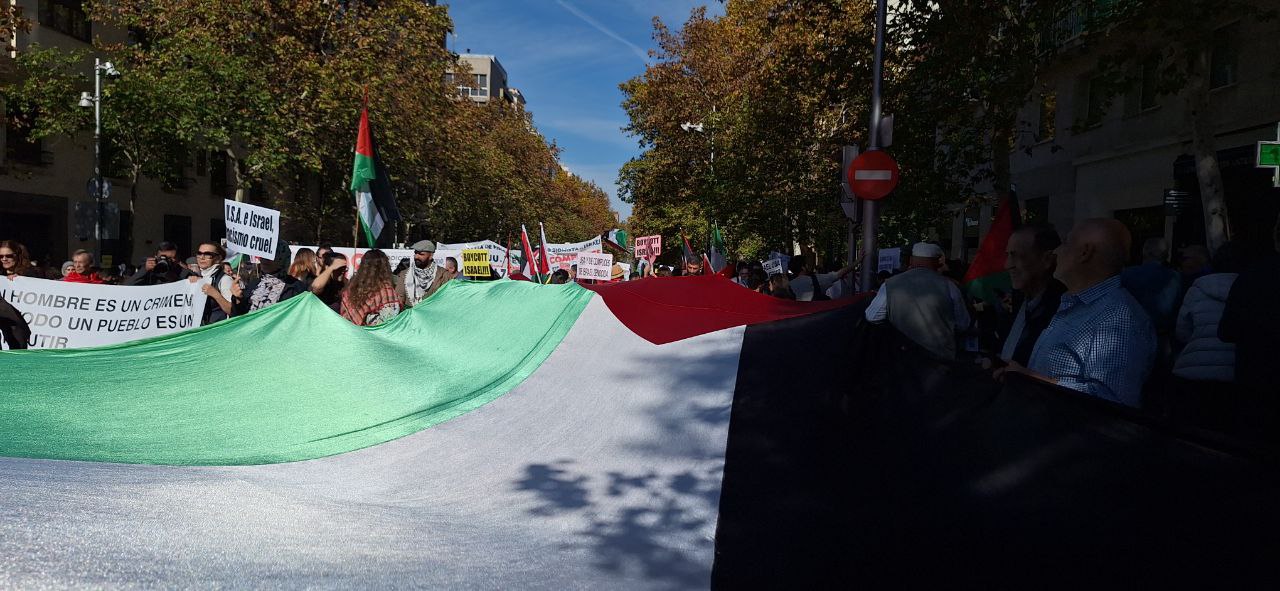 Ayer 18 de noviembre de 2023, en un ambiente cargado de indignación, varios miles de personas recorrieron las calles que transcurren entre la Embajada de Israel y la de EEUU para acusarles de ser los responsables directos del genocidio del pueblo palestino.
