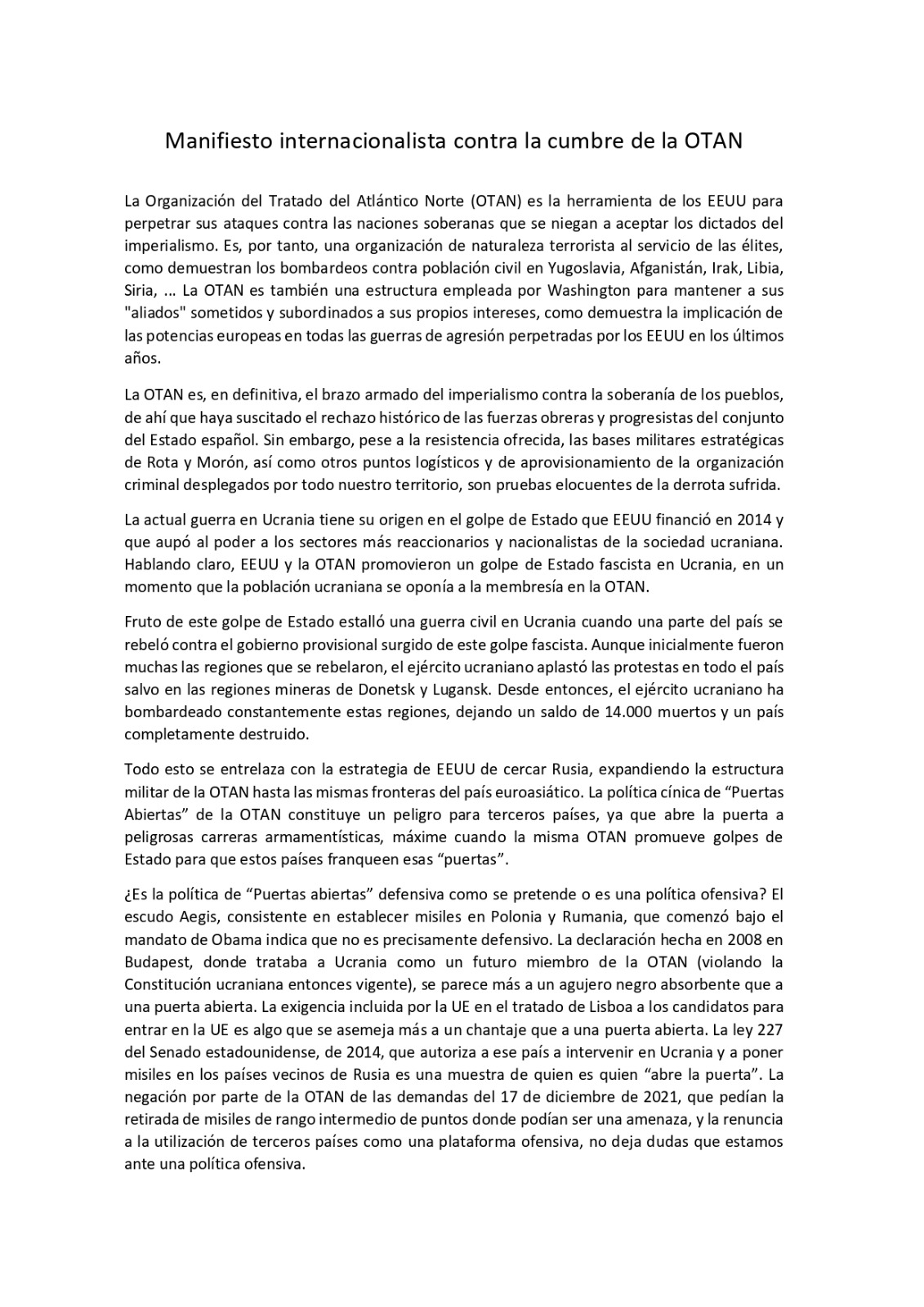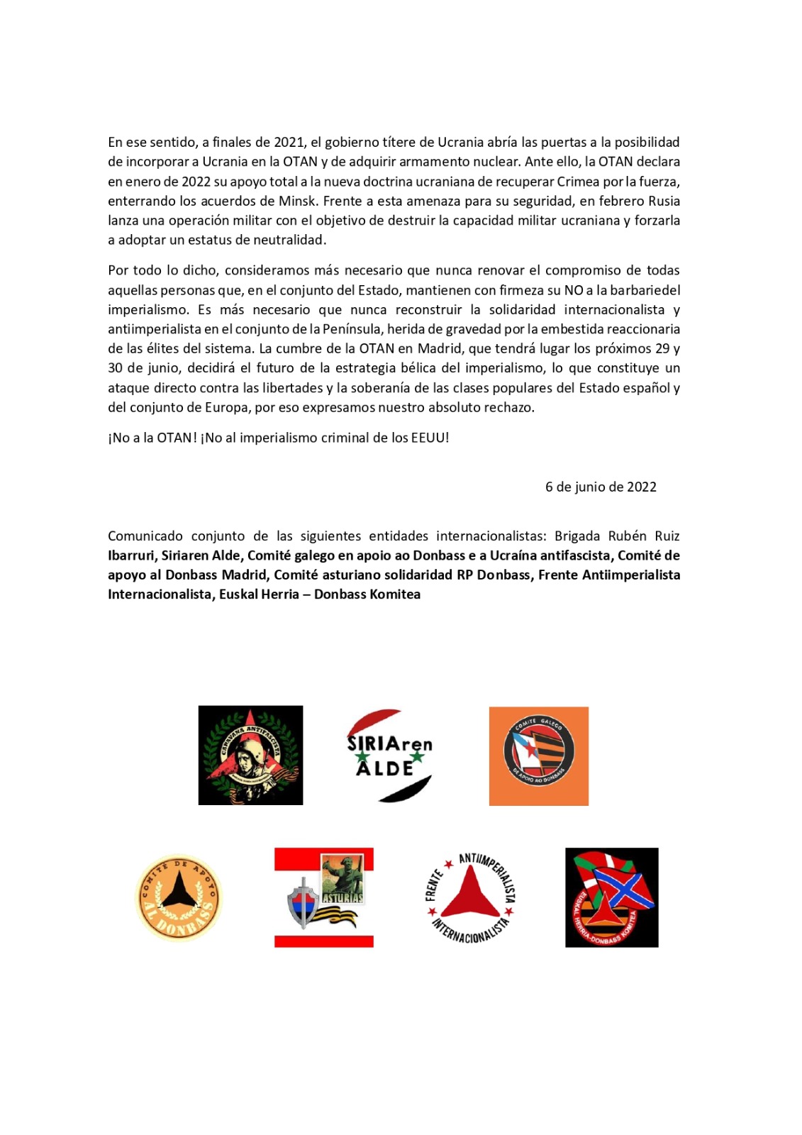 Por todo lo dicho, consideramos más necesario que nunca renovar el compromiso de todas aquellas personas que, en el conjunto del Estado, mantienen con firmeza su NO a la barbarie del imperialismo. Es más necesario que nunca reconstruir la solidaridad internacionalista y antiimperialista en el conjunto de la Península, herida de gravedad por la embestida reaccionaria de las élites del sistema. La cumbre de la OTAN en Madrid, que tendrá lugar los próximos 29 y 30 de junio, decidirá el futuro de la estrategia bélica del imperialismo, lo que constituye un ataque directo contra las libertades y la soberanía de las clases populares del Estado español y del conjunto de Europa, por eso expresamos nuestro absoluto rechazo.