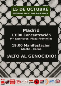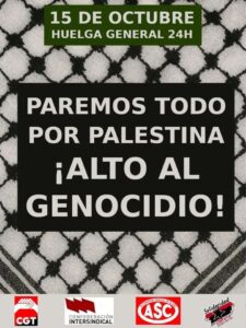 A iniciativa de los sindicatos CGT, Soldaridad Obrera, ASC y Confederación Intersindical, el próximo jueves 15 de octubre se ha convocado una jornada de lucha y huelga en todo el país para exigir del gobierno acciones reales y contundentes que rompan con la complicidad con el genocidio sionista de la que han venido haciendo gala desde que se iniciara tras el golpe de mano de la Resistencia Palestina del 7 de octubre de 2023, operación Diluvio de Al Aqsa.